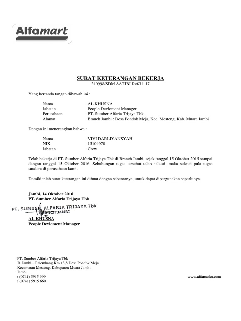 Pt sumber alfaria trijaya tbk dan entitas anaknya/and its subsidiaries laporan keuangan konsolidasian tanggal 31 desember 2019 dan untuk tahun yang berakhir pada tanggal tersebut Download surat verklaring pictures contoh surat. Contoh paklaring alfamart ilmusosial id : Pt sumber alfaria trijaya dengan brand alfamart adalah salah satu perusahaan retail besar di indonesia selain indomaret. Kima 8 blok ss no. Restoran kesehatan kecantikan penginapan rekreasi. Surat pengalaman kerja pdf simak juga soal tentang contohsurat serta belajar materi paklaring pt iss. Pt sumber alfaria trijaya, tbk merupakan salah satu perusahaan retail minimarket terkemuka di indonesia pemegang lisensi merek dagang alfamart yang tergabung dalam alfa group (alfamart, alfamidi, lawson, dan+dan). Produk kami uang elektronik pembayaran voucher agen tiket online transfer dana layanan pengiriman barang layanan lainnya. Tigaraksa, tangerang, kota tangerang, banten. Paklaring adalah istilah yang ditujukan untuk sesuatu yang berkenaan dengan surat penting diantaranya seperti surat keterangan pengalaman kerja, surat rekomendasi, surat referensi. Saat dibuka lowongan kerja khususnya walk ini interview di cabang pusat atau job fair. Syarat dan ketentuan serta fungsi paklaring.